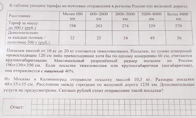 2) Расстояние 1238 км, тариф по столбцу 600 - 2000 км, 263 руб. за 0,5 кг, дополнительно 25 руб. за каждые полные/неполные 0,5 кг.