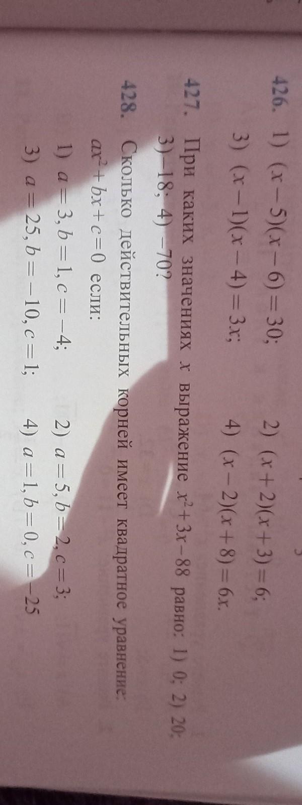 428)Кол-во действительных корней зависит от знака дискриминанта, если он положительный, то их 2, если отрицательный то их вовсе нет, если же равен нулю, то он 1. Составим уравнения и найдем дискриминант, сами корни считать не обязательно