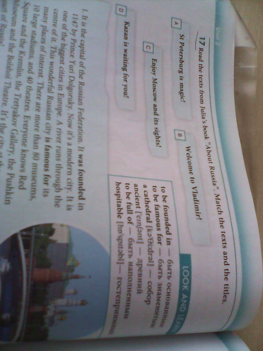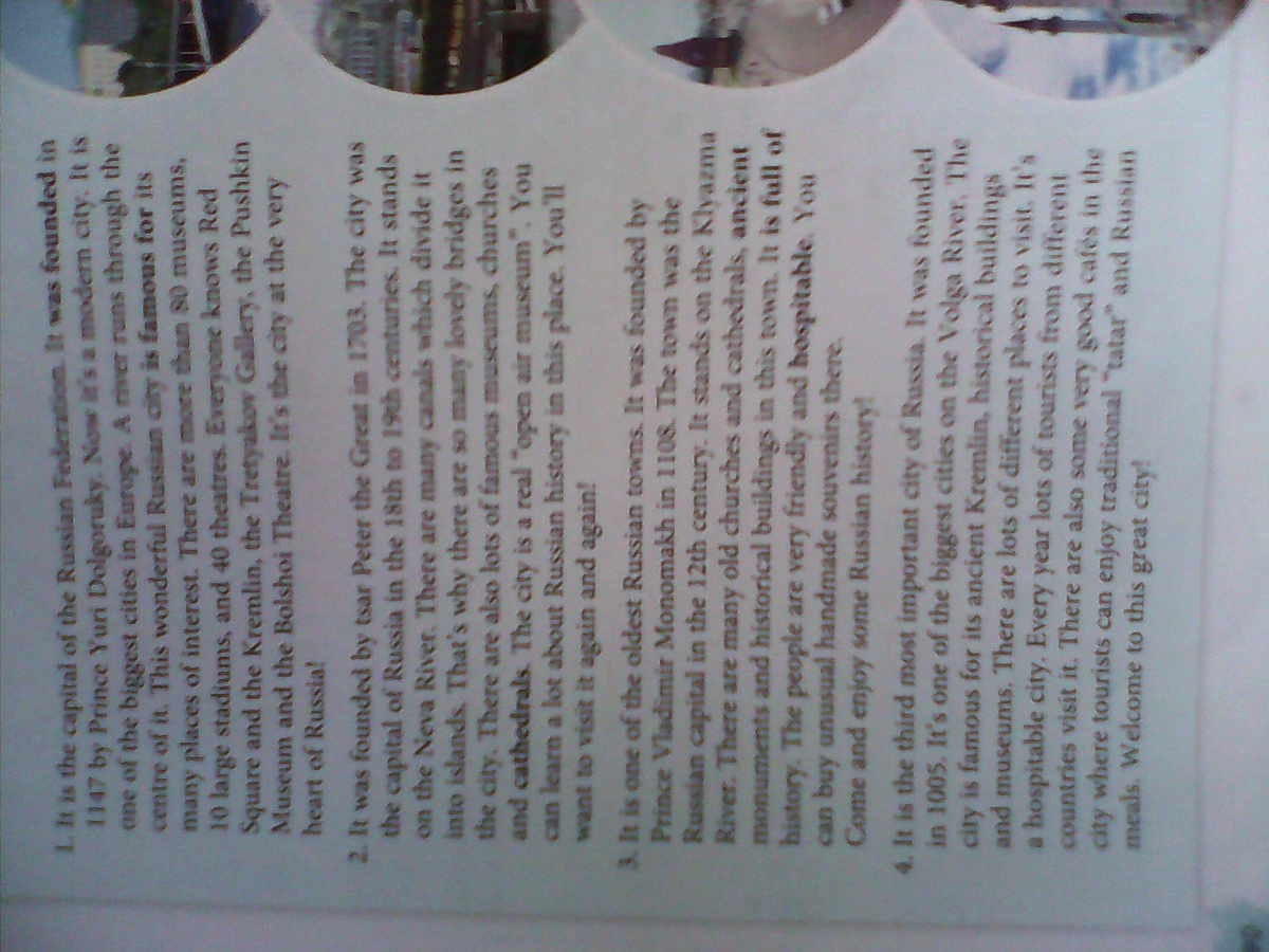 4 - D Это третий среди главных городов России. Он был основан 1005г. Это один из самых больших городов на Волге. Город знаменит своим древним кремлём, историческими сооружениями и музеями. Там много достопримечательностей. Это гостеприимный город. Каждый год много туристов из разных стран приезжают сюда. В городе также много очень хороших кафе, где гости города могут попробовать национальную татарскую и русскую кухню. Добро пожаловать в этот великий город!