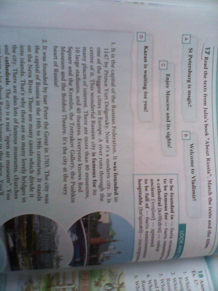 2 - А Этот город был основан царём Петром в 1703 г Этот город был столицей России в 18-19 вв Он стоит на Неве. Здесь много каналов которые разделяют город на острова. Вот почему там так много красивых мостов. Там много знаменитых музеев, церквей и соборов. На самом деле сам город музей на свежем воздухе. Здесь ты можешь много узнать об истории России. Ты захочешь приезжать сюда снова и снова