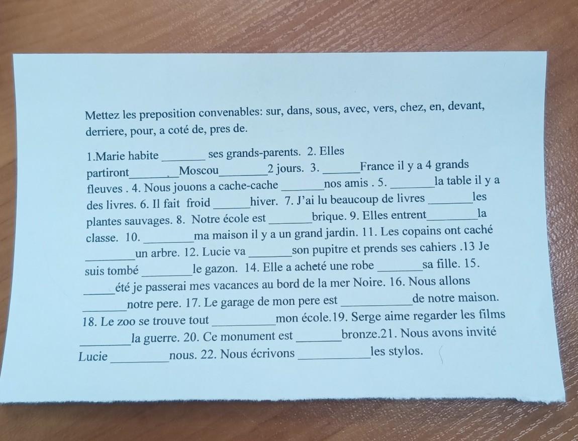 1 .Marie habite chez ses grands-parents. 2. Elles partiront vers Moscou dans deux jours. 3. En France il y a quatre grands fleuves . 4. Nous jouons a cache-cache avec nos amis . 5. Sur la table il y a des livres. 6. Il fait froid en hiver. 7. J’ai lu beaucoup de livres sur les plantes sauvages. 8. Notre école est en brique. 9. Elles entrent dans la classe. 10. Derriere ma maison il y a un grand jardin. 11. Les copains ont caché derriere un arbre. 12. Lucie va vers son pupitre et prends ses cahiers .13 Je suis tombé sur le gazon. 14. Elle a acheté une robe pour sa fille. 15. En été je passerai mes vacances au bord de la mer Noire. 16. Nous allons chez notre père. 17. Le garage de mon père est a coté de notre maison. 18. Le zoo se trouve tout près de mon école. 19. Serge aime regarder les films sur la guerre. 20. Ce monument est en bronze. 21. Nous avons invité Lucie chez nous. 22. Nous écrivons avec les stylos.
