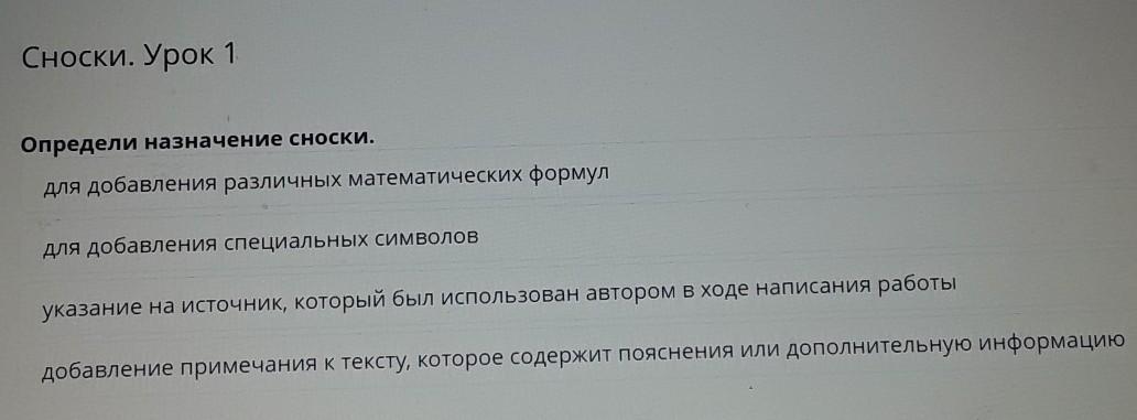 Сноски необходимы для: добавление примечания к тексту, которое содержит пояснения или дополнительную информацию.