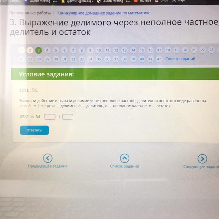 Выполни действие и вырази детимое через неполное частное детитель и остаток в виде равенства