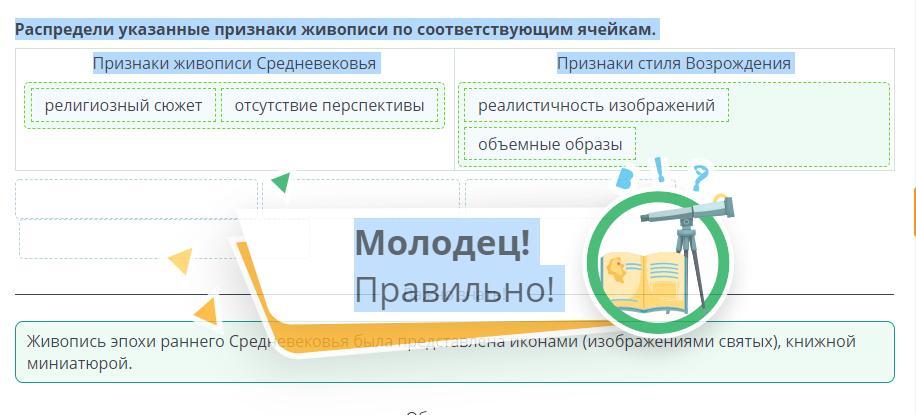 Распредели указанные признаки живописи по соответствующим ячейкам.