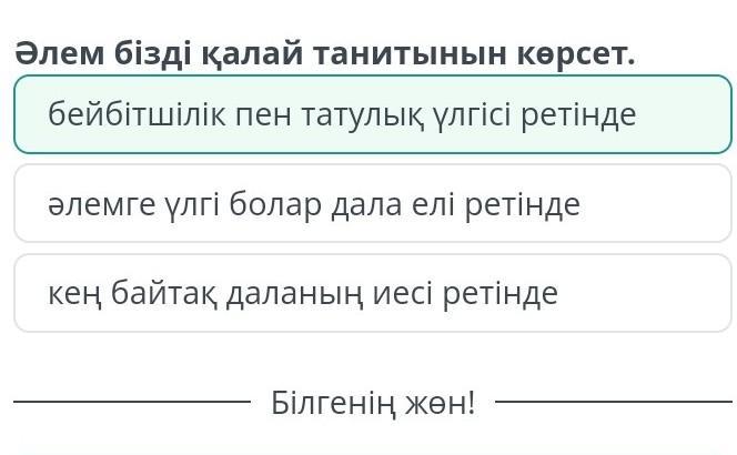 Бейбітшілік пен татулық үлгісі ретінде-себебі біз қонақжай елміз,әр елге келген ұлт өкілдерімен тату боламыз,басқалар секілді атыспаймыз,төбелеспейміз тек бейбіт өмір сүреміз.Оларға көмек керек болса көмек береміз.Осы арқылы ел бізді танып біледі.