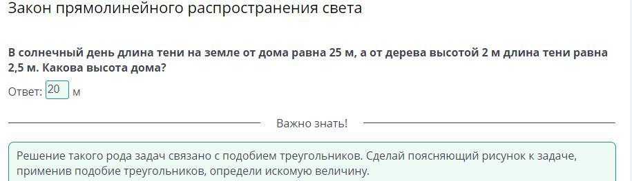 В солнечный день длина тени на земле от дома равна 25 м, а от дерева высотой 2 м длина тени равна 2,5 м. Какова высота дома?
