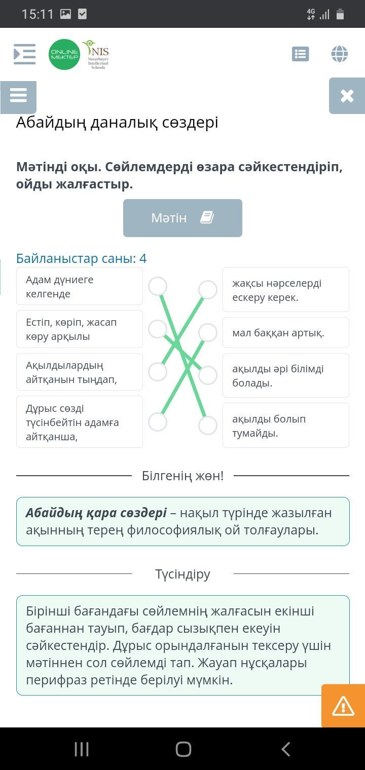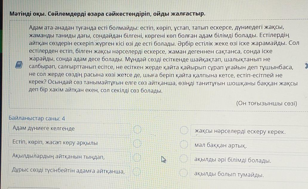 Мәтінді оқы. Сөйлемдерді өзара сәйкестендіріп, ойды жалғастыр.