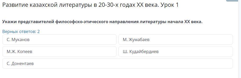 Укажи представителей философско-этического направления литературы начала ХХ века. М. Жумабаев С. Донентаев Ш. Кудайбердиев С. Муканов М.Ж. Копеев