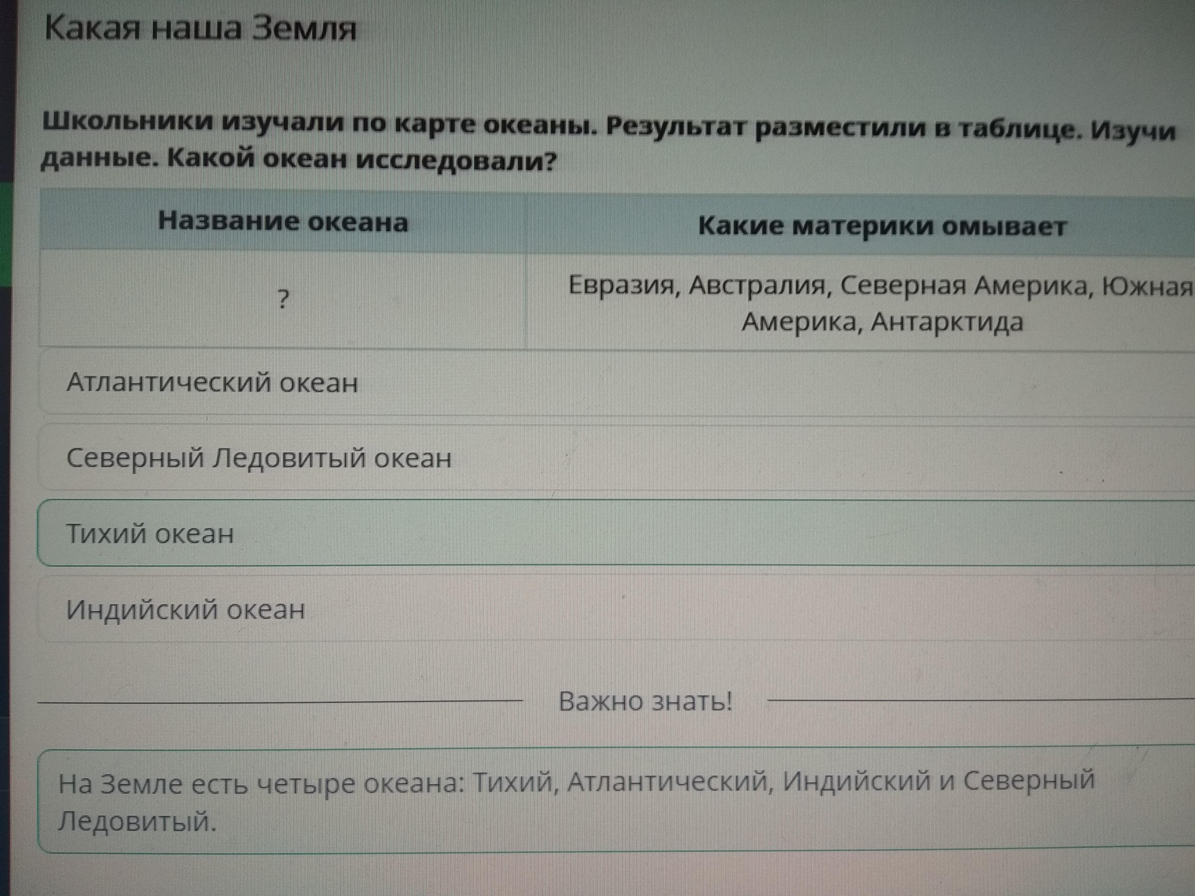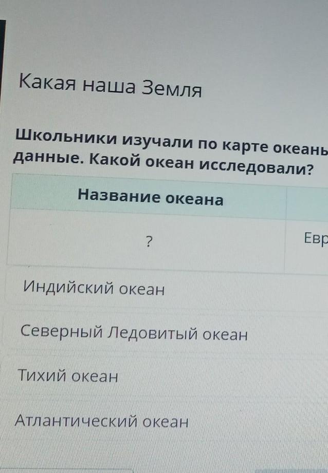 Школьники изучали по карте океаны. Результат разместили в таблице. Изучи