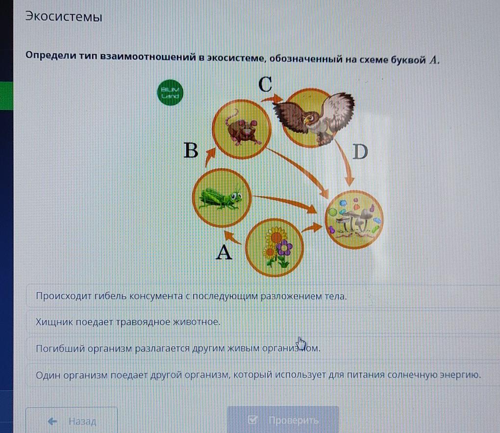 Определи тип взаимоотношений в экосистеме, обозначенный на схеме буквой А.