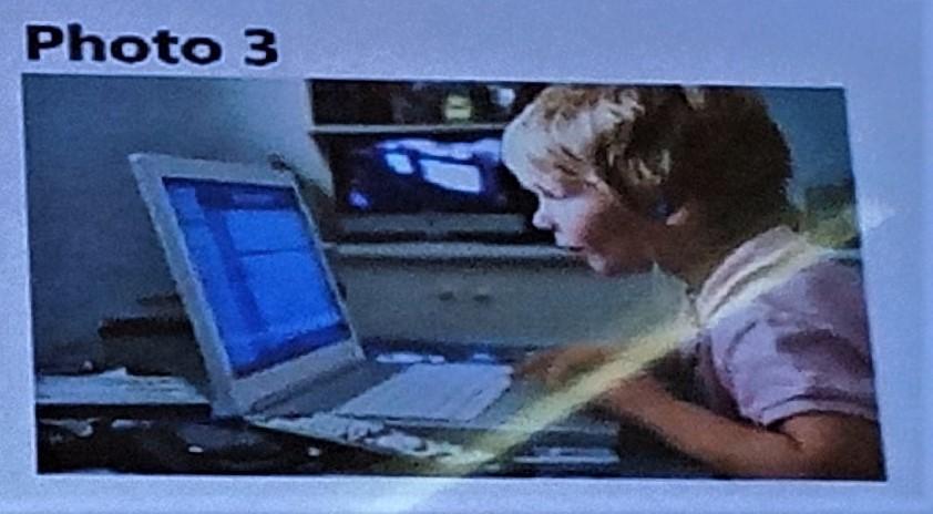 На этой фотографии я вижу мальчика, который делает домашнее задание. Он блондин. У него короткие вьющиеся волосы. Он плохо видит, потому что наклонился над ноутбуком. Мальчик носит футболку.