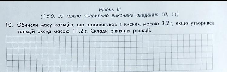 Обчисли масу кальцію, що прореагував з киснем масою 3,2 г, якщо утворився кальцій оксид масою 11,2 г. Склади рівняння реакції