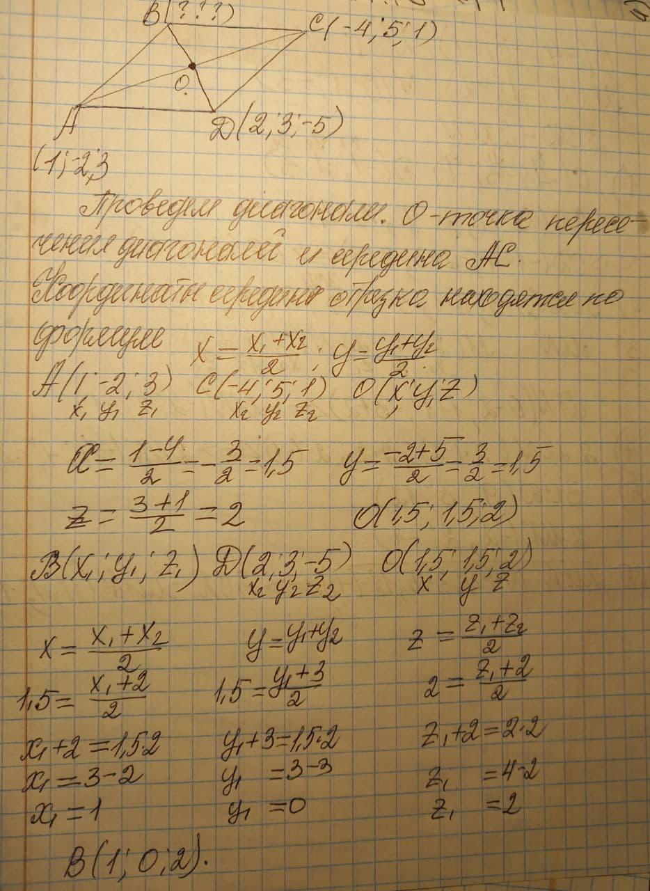 Дано ABCD параллелограмм А( 1- 2 3) C (- 4 5 1 )D(2 3 - 5) Найдите координаты вершины B