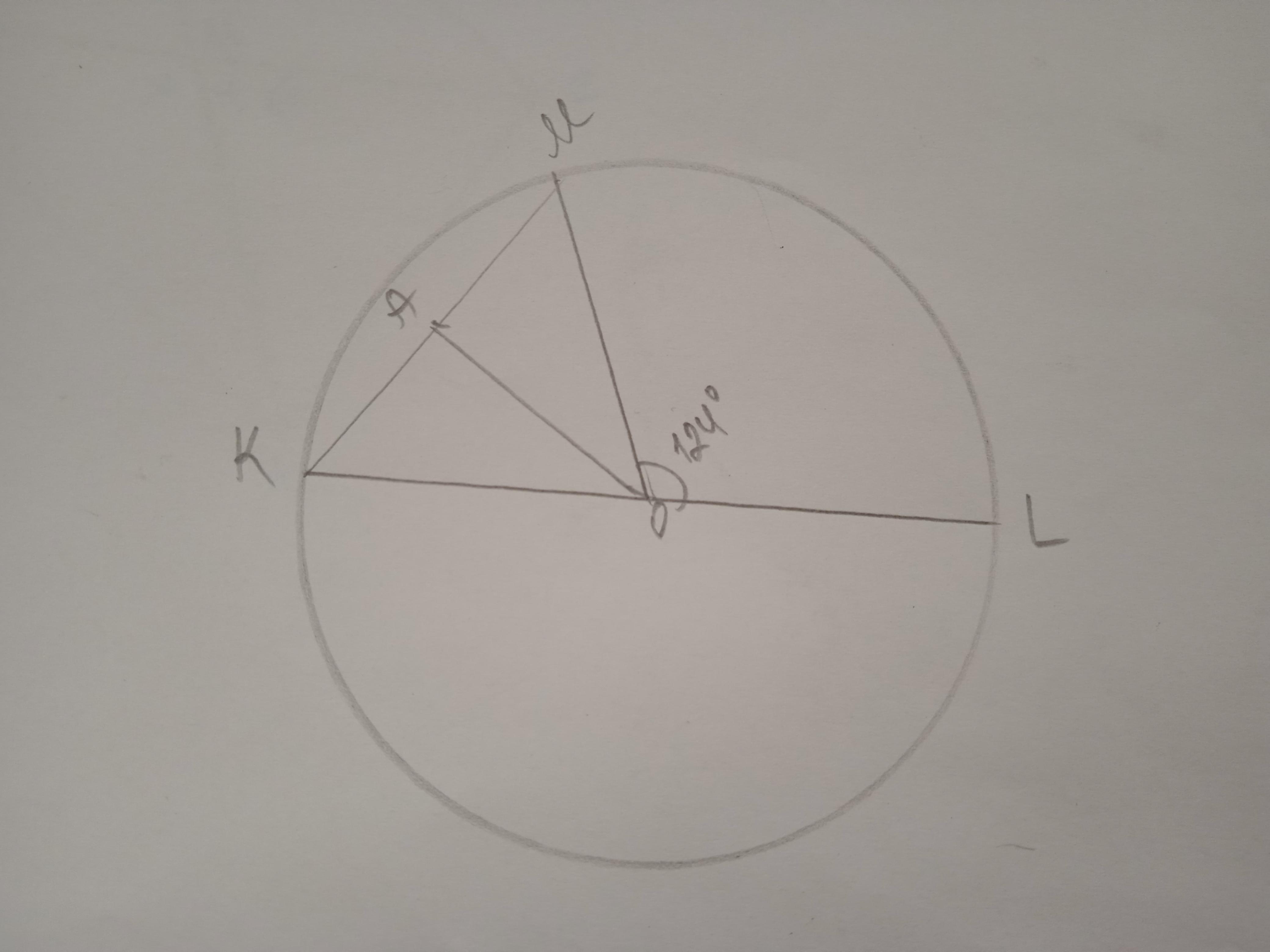 Якщо кут LOM дорівнює 124 градуси, то на кут KOM залишається (180-124) 56 градусів.