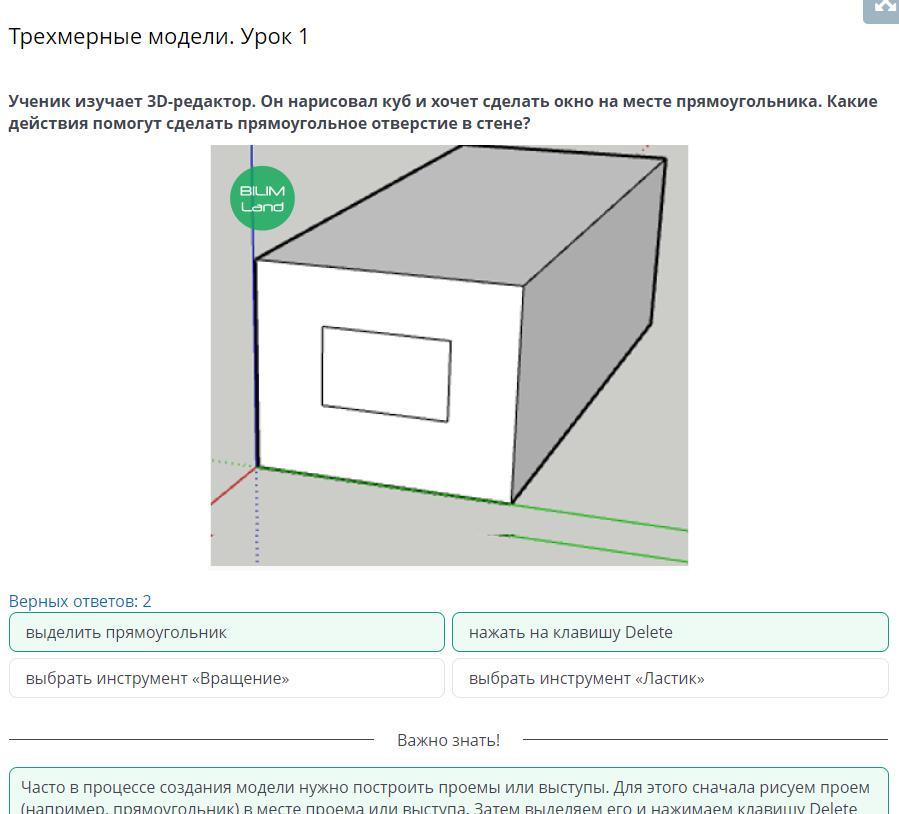 Ученик изучает 3D-редактор. Он нарисовал куб и хочет сделать окно на месте прямоугольника. Какие действия помогут сделать прямоугольное отверстие в стене?