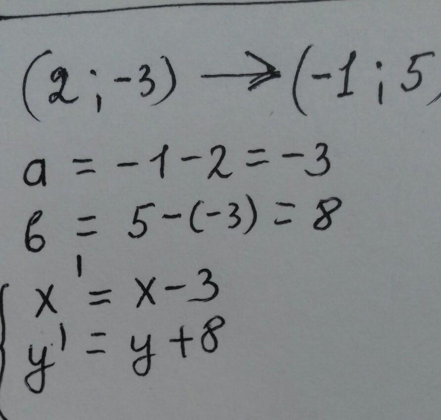 знайдіть значення а і б в формулах паралельного перенесення x'=x+2 , y'=y +b , якщо точка (2,-3) переходить у точку (-1,5)