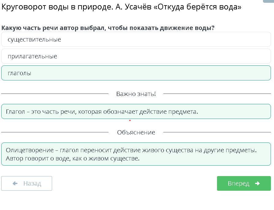 Круговорот воды в природе. А. Усачёв «Откуда берётся вода» Какую часть речи автор выбрал, чтобы показать движение воды? глаголы прилагательные существительныеПомогите пожалуйста
