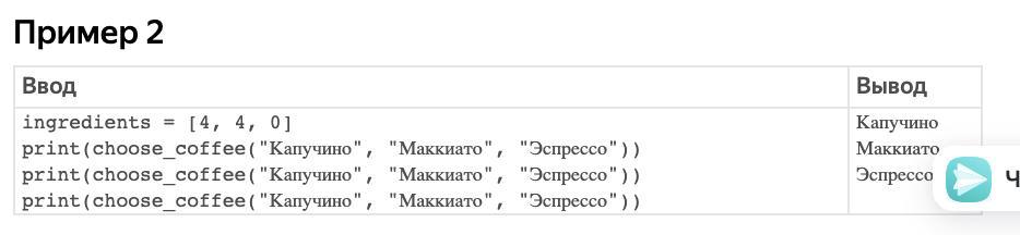 Надо написать функцию choose_coffee(preference1, preference2,..., preferenceN), которая возвращает напиток, который можно приготовить из имеющихся продуктов (ingredients). На вход функция принимает заранее неизвестное количество предпочтений посетителя. Все напитки перечислены в порядке убывания предпочтений и гарантированно не повторяются. Бариста готовит наиболее предпочитаемый напиток из доступных.