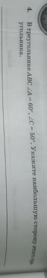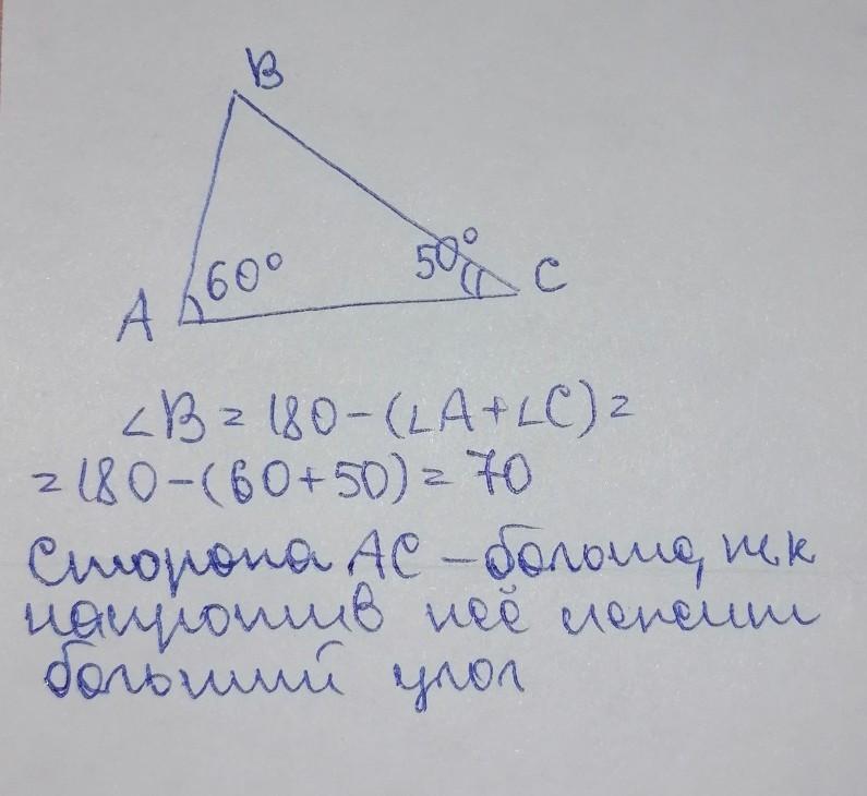 в треугольнике abc угол a равен 60 г угол c равен 50г укажите наибольшую сторону этого треугольника