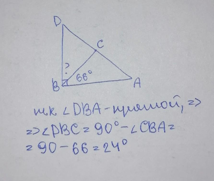 Дан прямоугольный треугольник DBA. BC — отрезок, который делит прямой угол ABD на две части. Сделай соответствующий рисунок и вычисли угол DBC, если угол CBA равен 66°. Ответ: ∢DBC