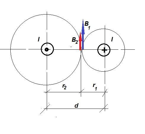 Два длинных параллельных проводника находятся на расстоянии d=5 см друг от друга. По проводникам в противоположных направлениях текут одинаковые токи I = 10 А. Определите магнитную индукцию в точке,