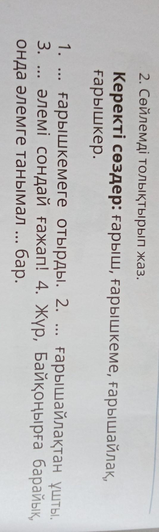 1.Ғарышкер ғарышкемеге отырды . 2.Ғарышкеме ғарышайлақтан ұшты 3.Ғарыш әлемі сондай ғажап ! 4. Жүр , Байқоңырға барайық онда әлемге танымал ғарышайлақ бар .