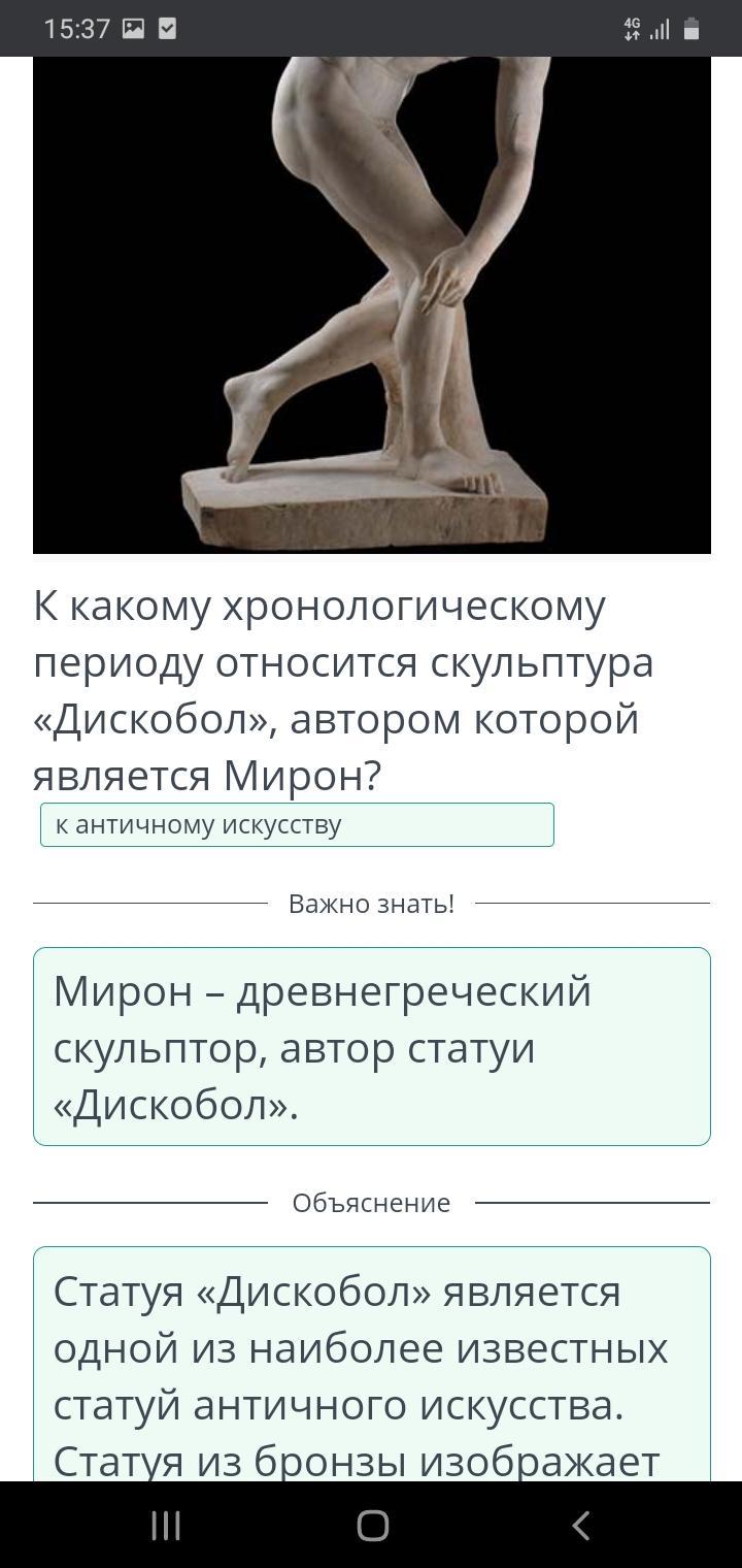 К какому хронологическому периоду относится скульптура «Дискобол», автором которой является Мирон?