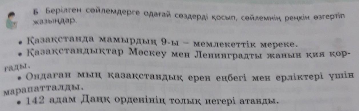 Берілген сөйлемдерге одағай сөздерді қосып, сөйлемнің реңкін өзгертіп