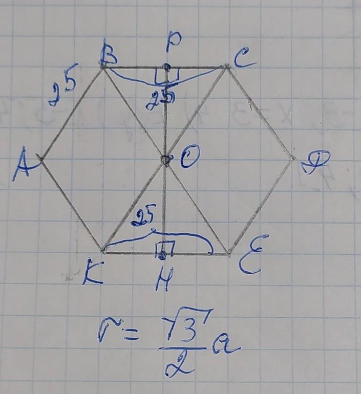 Проведём диагонали СК и ВЕ и обозначим точку их пересечения О, которая также является центром вписанной окружности. Проведём 2 радиуса ОР и ОН. Радиус вписанной окружности в правильном шестиграннике вычисляется по формуле: