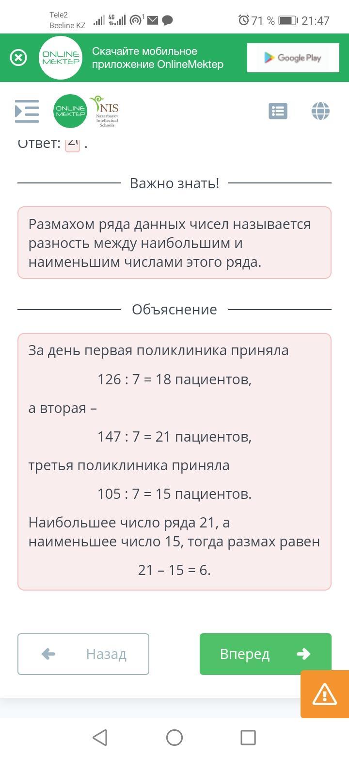 Статистические данные и их характеристики: среднее арифметическое, мода, медиана, размах. Урок 2 Три поликлиники неделю принимали пациентов. Первая поликлиника приняла 126 пациентов, вторая – 147 пациентов, а третья – 105 пациентов. Найди размах количества пациентов за день в трех поликлиниках, если считать, что они каждый день принимают одинаковое количество пациентов. Ответ:.