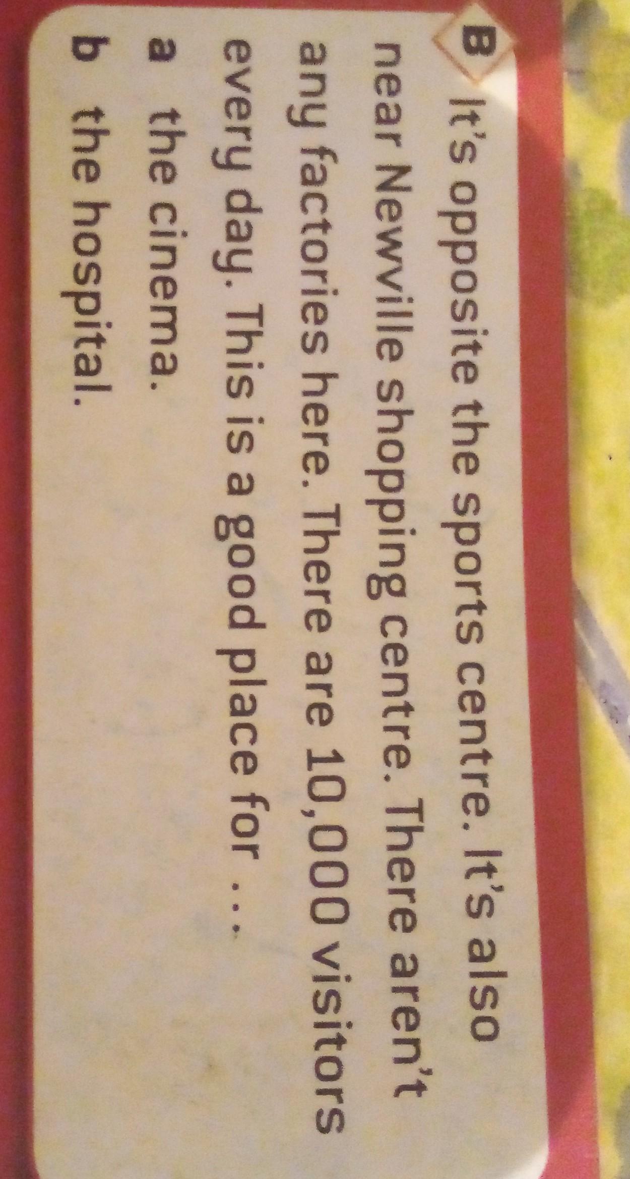 B It's opposite the sports centre. It's also