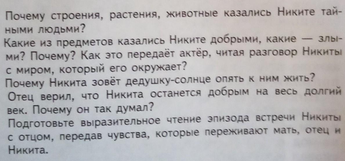 2. Какие из предметов казались Никите добрыми, какие — злыми? Почему? Как это передаёт актёр, читая разговор Никиты с миром, который его окружает?