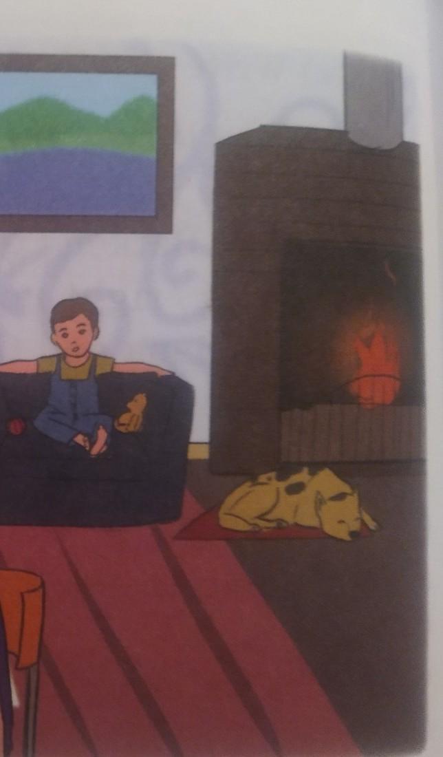 Прежде всего, на этом снимке мы видим мальчика и собаку. Мальчик сидит на диване, на полу спит собака. Также на заднем плане - картина и камин. На картине изображен красивый пейзаж, и мы видим огонь в камине, который согревает комнату.