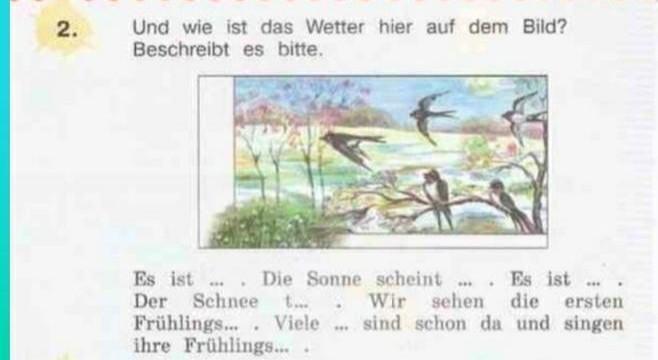 Es ist Frühling. Die Sonne scheint hell. Es ist warm. Der Schnee taut. Wir sehen die ersten Frühlingsblumen. Viele Vögel sind schon da und singen ihre Frühlingslieder.