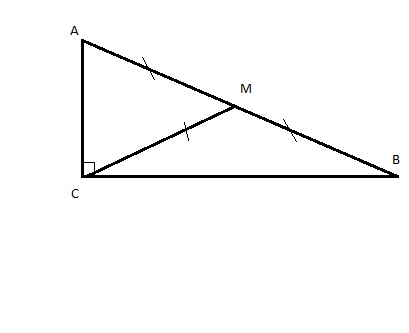 пусть коэффициент отношения - х, тогда х+2х=90 градусов, 3х=90, х=30 градусов. 90-30=60 градусов. Прямой угол разделился медианой на углы в 30 и 60 градусов. Медиана, проведённая из прямого угла, = половине гипотенузы, поэтому