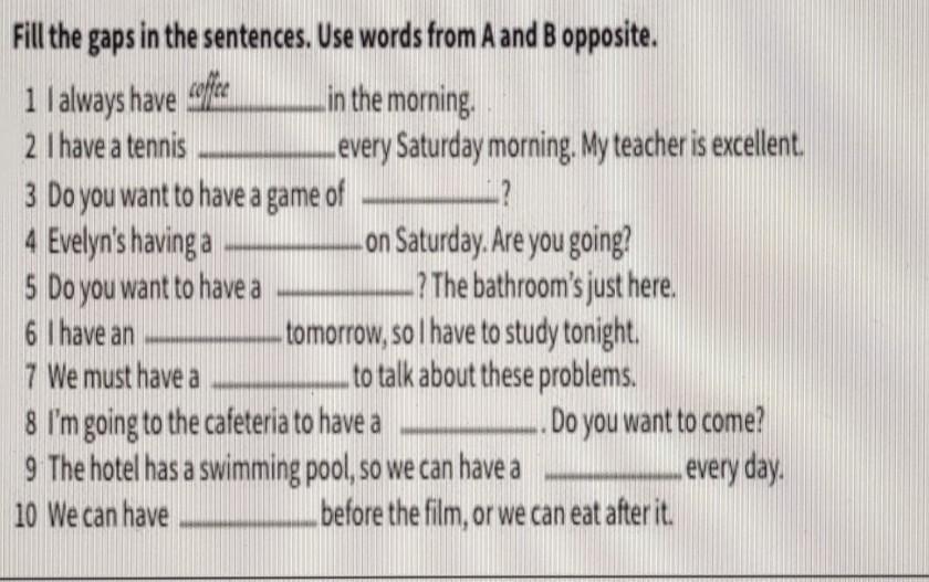 Ответ:1 - coffe 2 - club 3 - tennis 4 - birthday 5 - незнаю 6 - незнаю 7 - незнаю 8 - coffe 9 - swimming 10 - незнаю