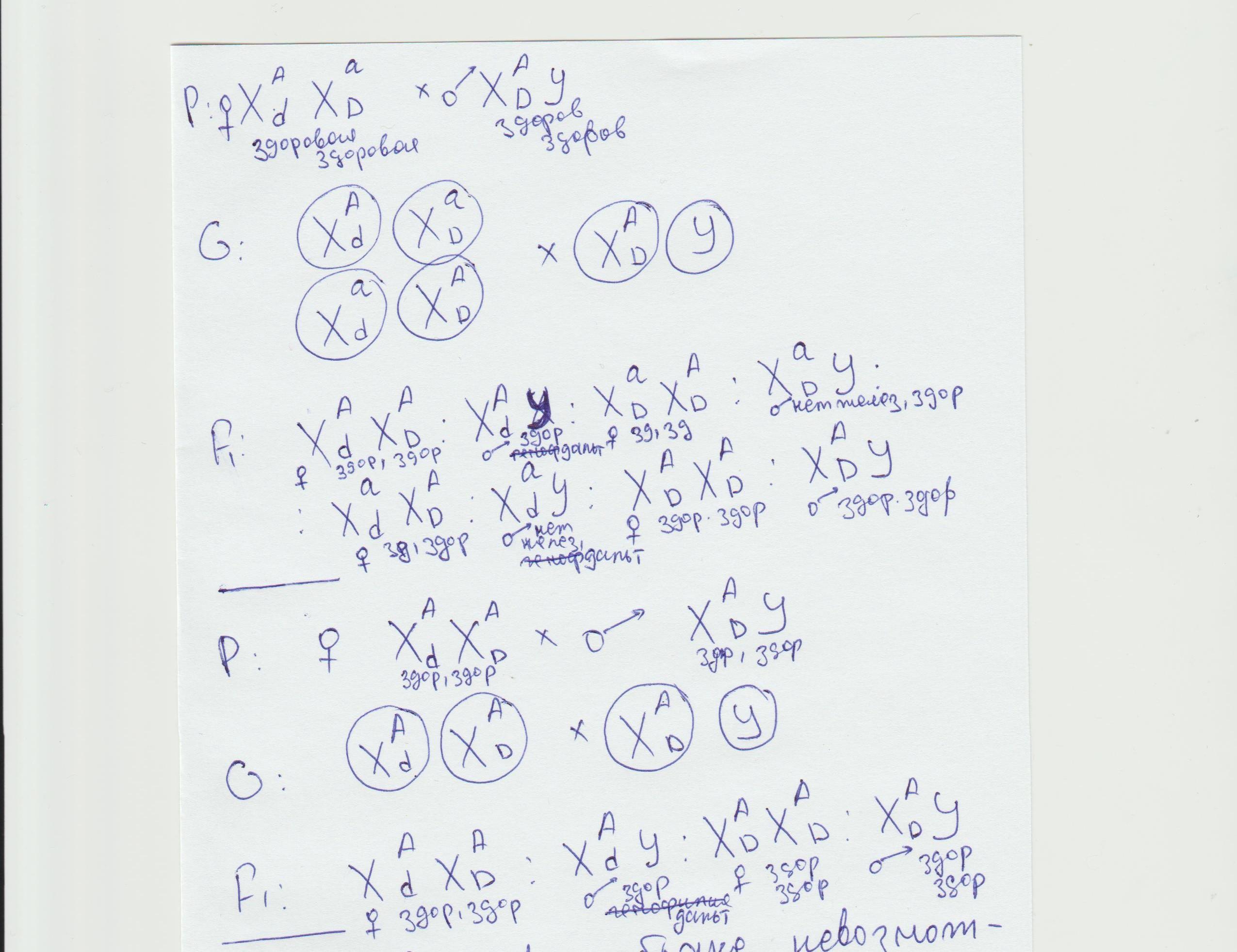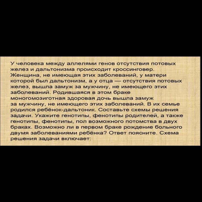 Ответ на вопрос: в первом браке может родиться ребенок с двумя заболеваниями, так как про кроссинговере у матери образуется гамета с двумя аномалиями, которая вместе с Y-хромосомой отца даст ребенка дальтоника с отсутствием желез