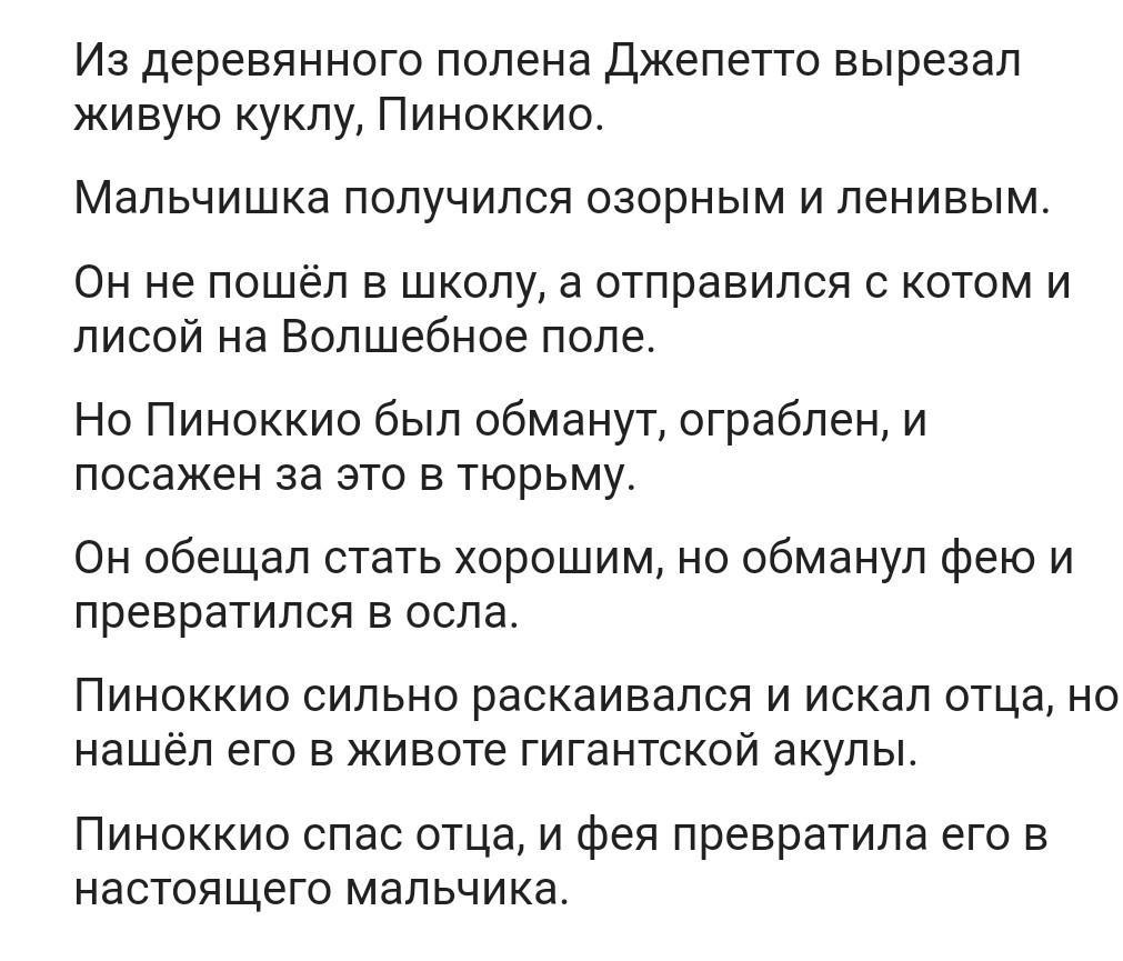 Старому столяру Антоніо на прізвисько «майстер Вишня» трапляється шматок дерева. Майстер Вишня збирається зробити з нього ніжку для столу. Але як тільки він починає працювати, поліно скаржиться на біль і лоскіт. Приголомшений столяр непритомніє від страху. До Антоніо заходить його друг Джеппетто на прізвисько «Кукурудзяний Коржик», якому прийшла в голову ідея зробити дерев’яного чоловічка, який би вмів танцювати, фехтувати і перекидатися в повітрі.