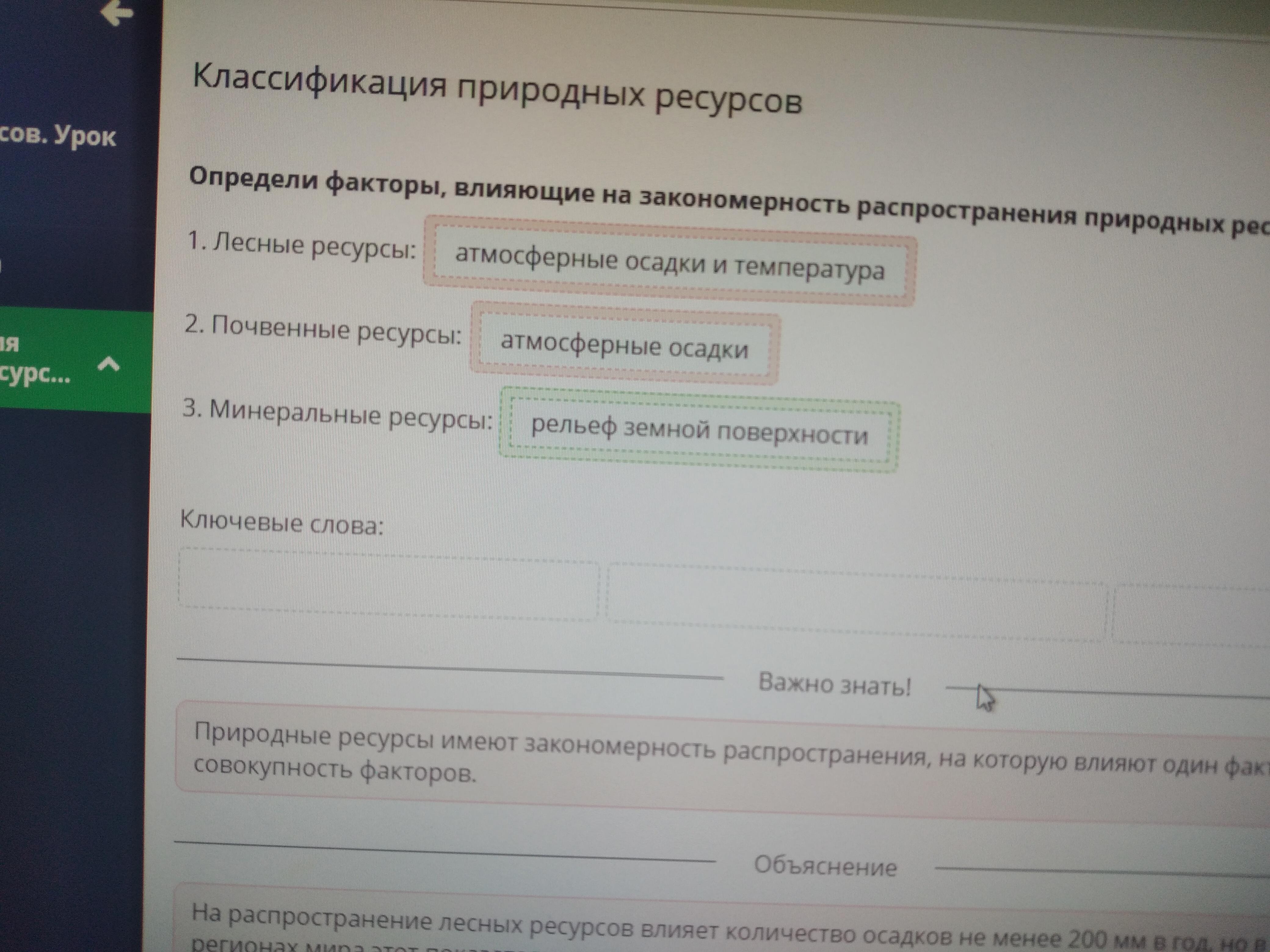 Определи факторы, влияющие на закономерность распространения природных ресурсов.