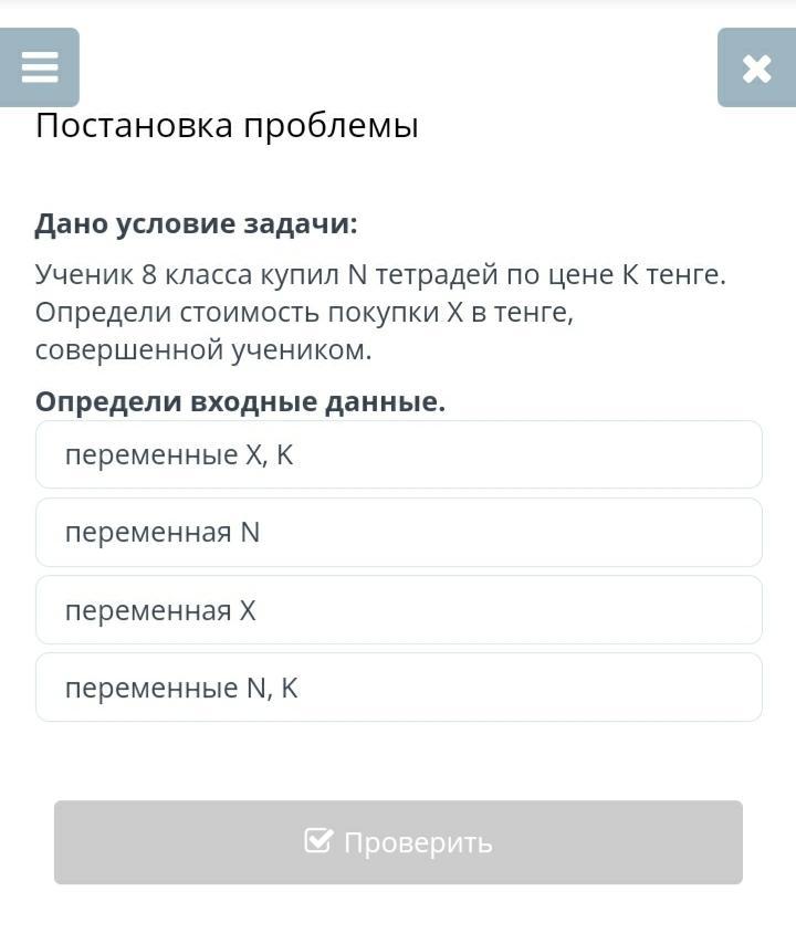 Ученик купил N тетрадей по цене K тенге, следовательно, входные данные у нас идут в переменны N и K