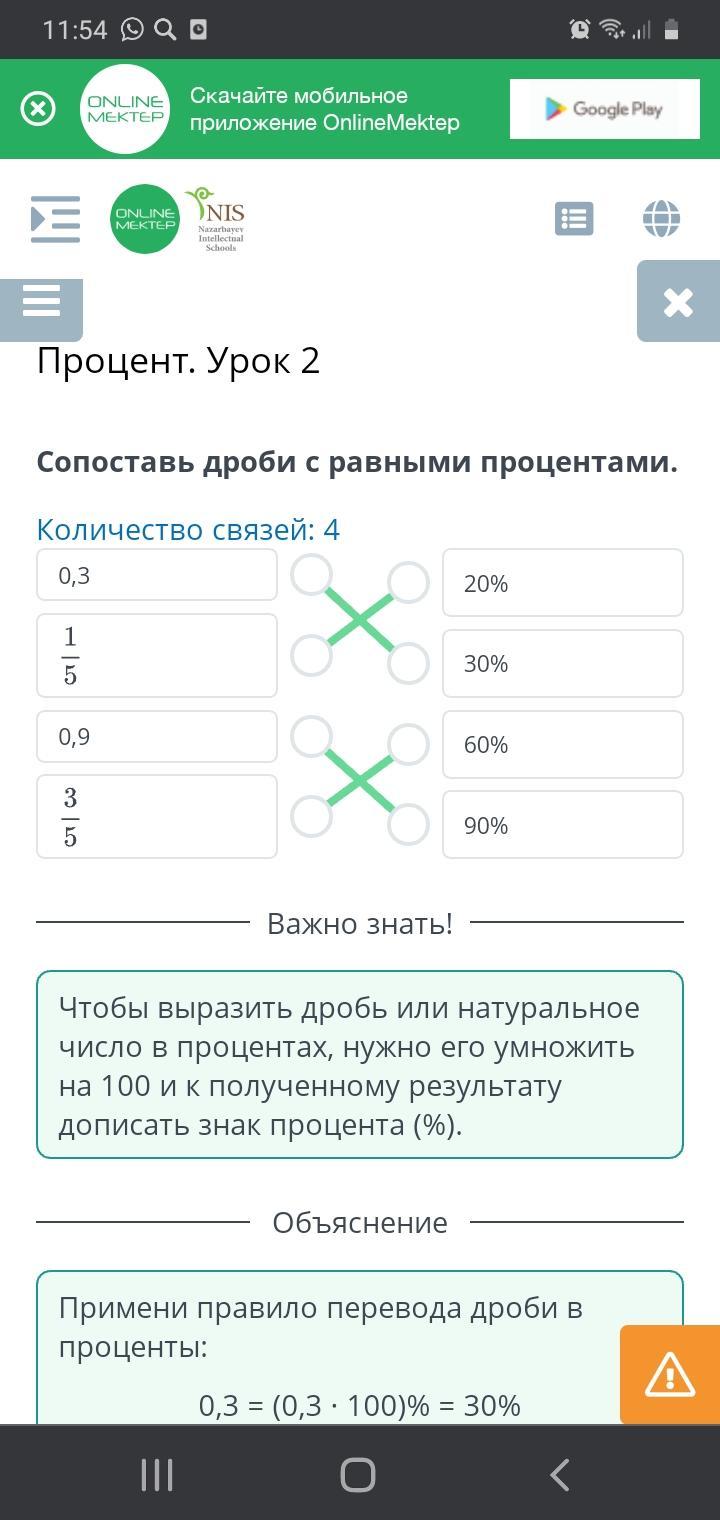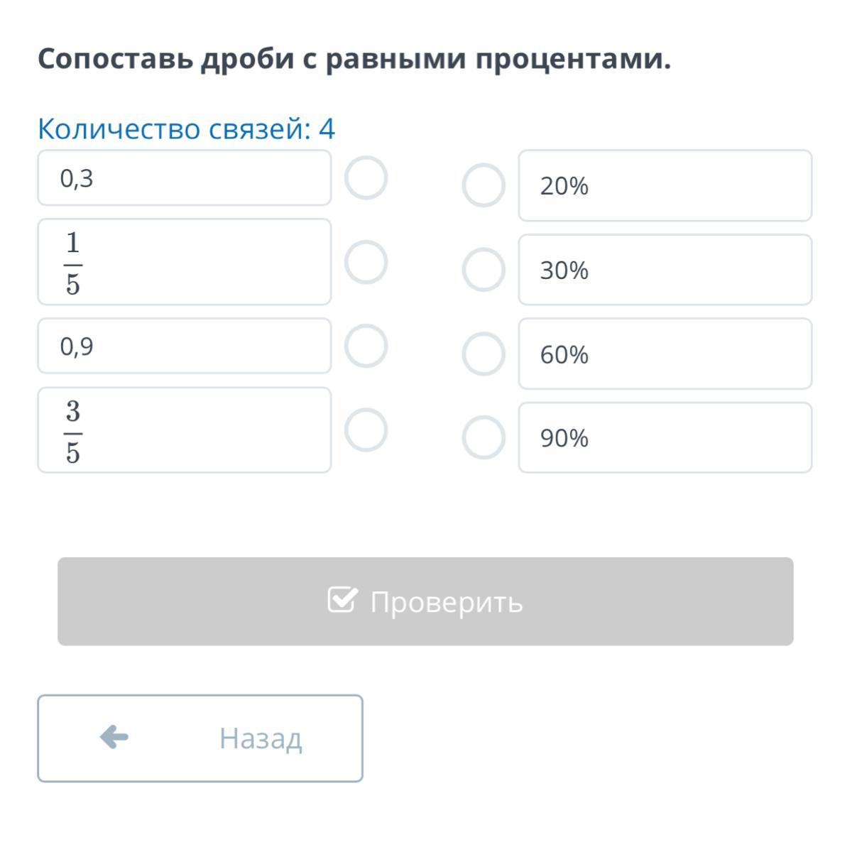 Сопоставь дроби с равными процентами.