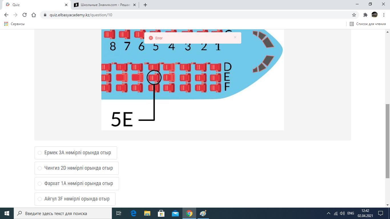 Айгүл, Бибігүл, Чингиз, Динара, Ермек пен Фархат ұшақтың алғашқы 5 қатарынан билет сатып алған жолаушылар. Олардың отыратын орындары жайлы келесі мәліметтер белгілі: