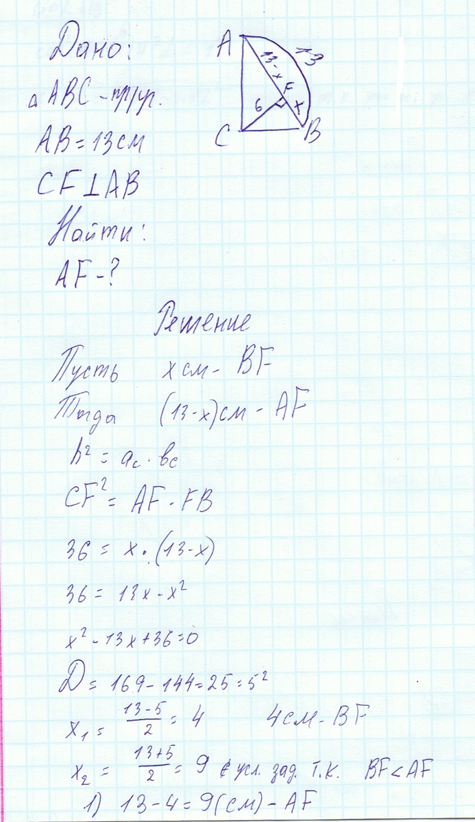 гипотенуза прямоугольного треугольника 13 см, а опущенная на гипотенузу высота 6 см. Найдети проекцию большего катета на гипотенузу.