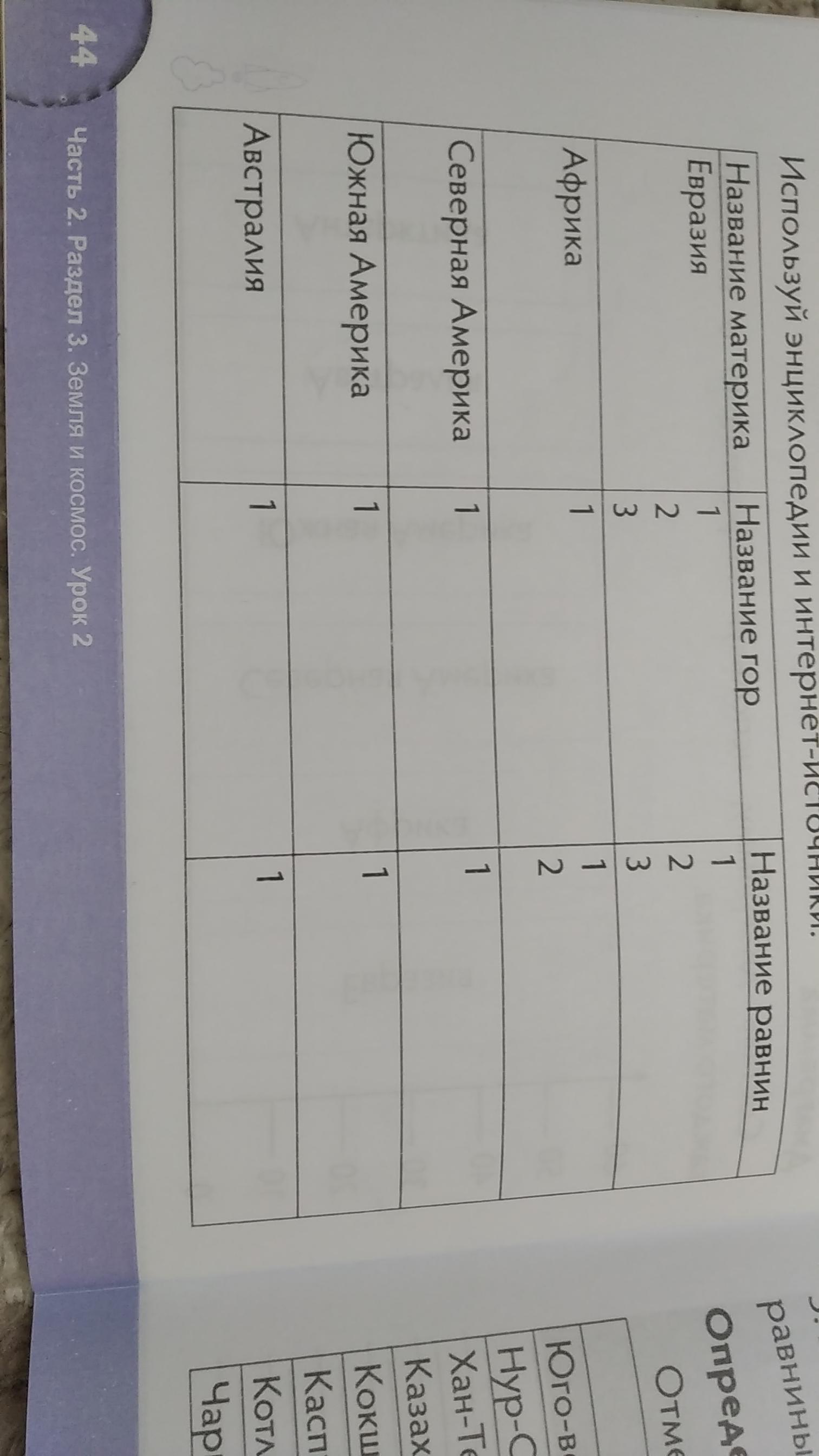 Напиши название гор и равнин материков, данных в таблице используя энциклопедии и интернет источники