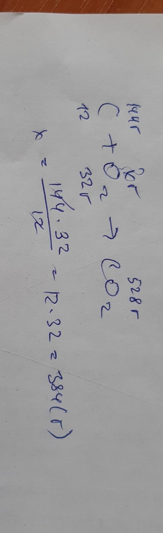 Оксиди неметалів є одним з джерел забруднення повітря. Вуглець масою 144 г згорів на повітрі. В результаті реакції утворилося 528 г карбон(IV) оксиду CO2. Укажи масу кисню, що витратився.