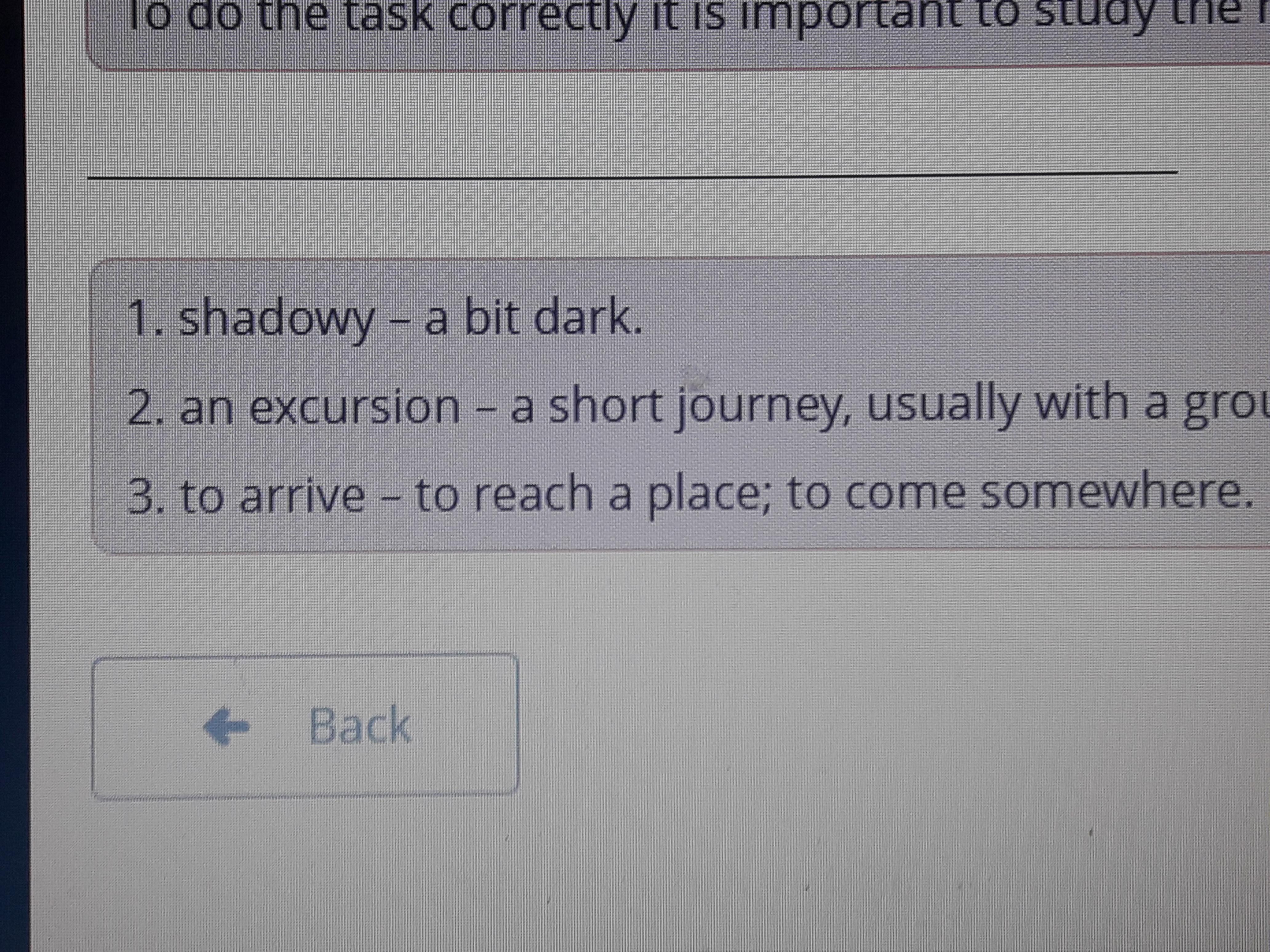 1.Shadowy, 2. An excursion, 3. To arrive, для тех кто не понял¡