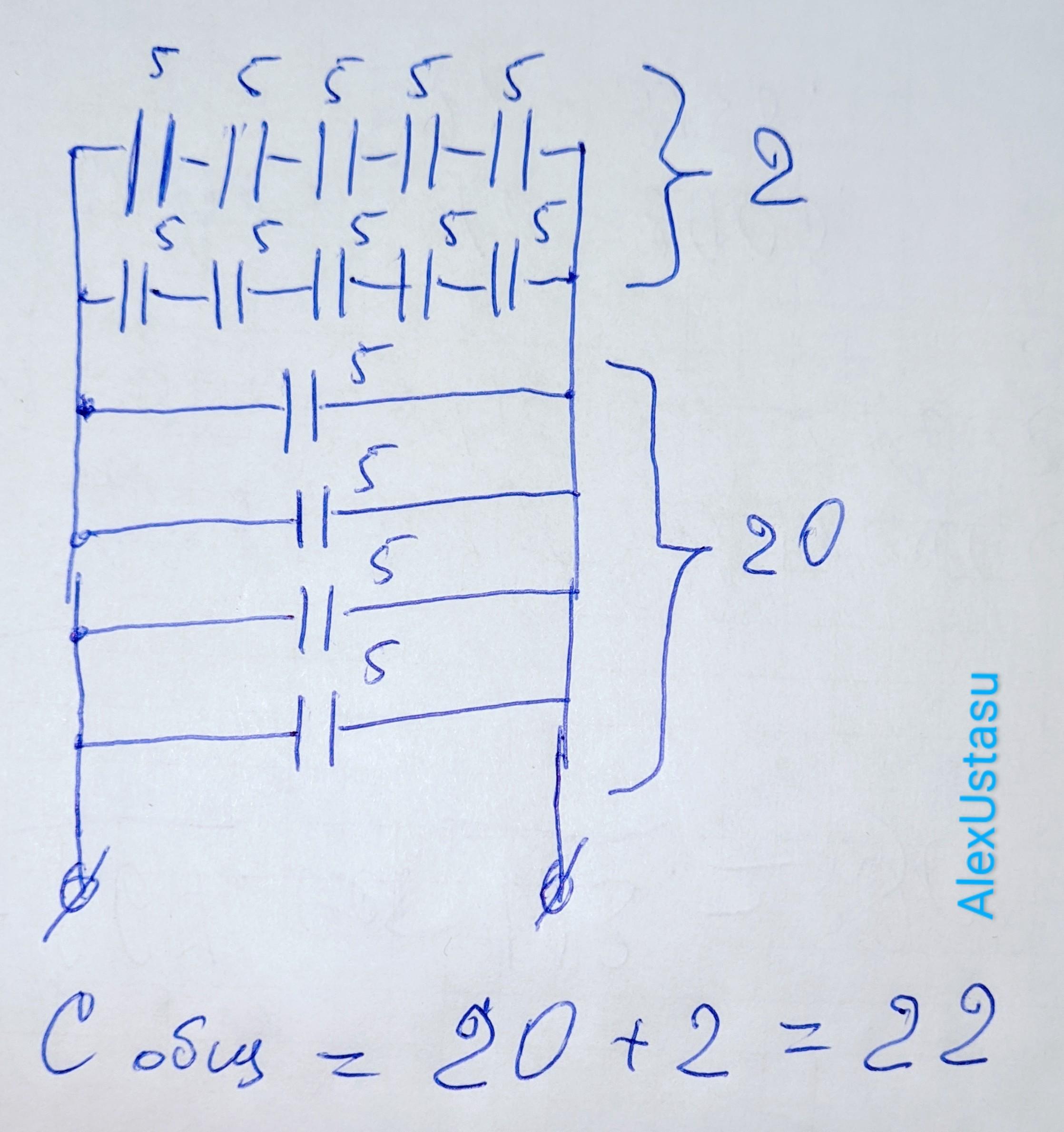 Для Cобщ=22 мкФ потребуется 14 конденсаторов 5мкФ
