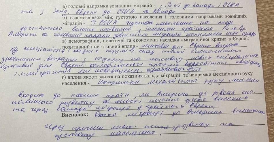 Висновок: отже міграції до Америки виникають через ? низький рівень розвитку та велику густоту населення.