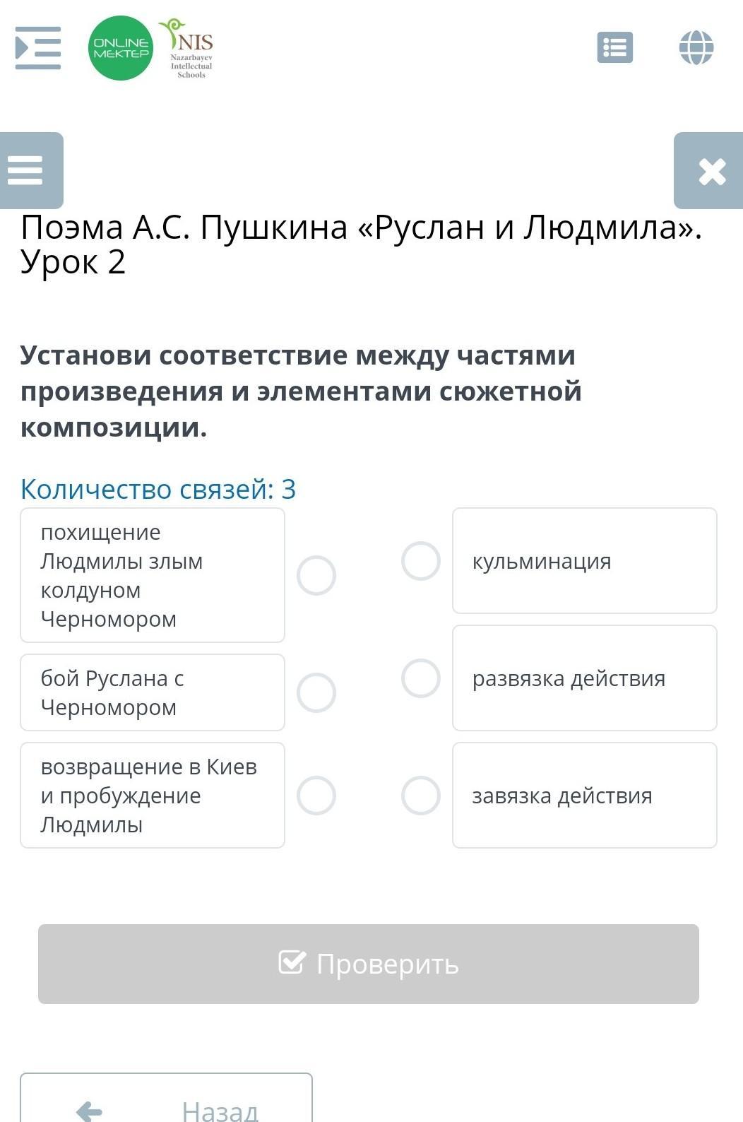 Ответ:похищение завязка, бой кульминация, возвращение в Киев развязка.