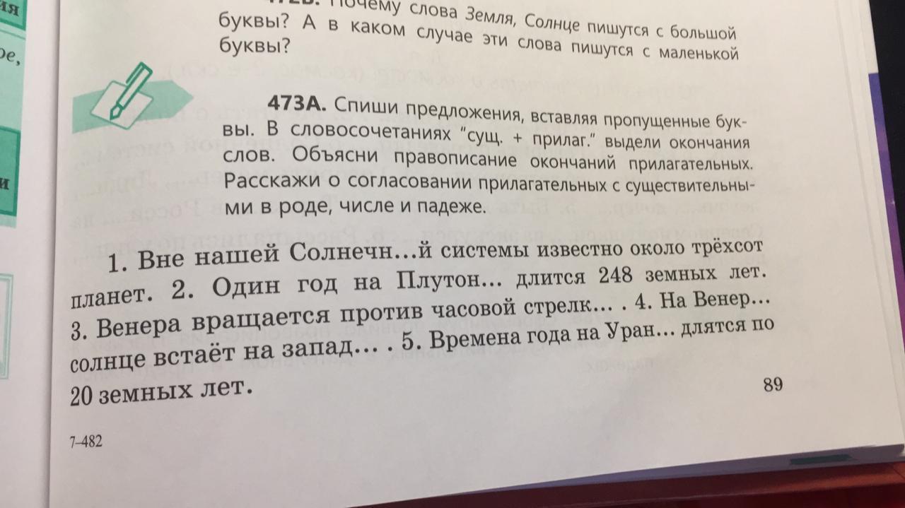 1. Вне нашей Солнечной ( окончание ой) системы ... 2. Один год на Плутоне ( оконч е) ... 3. Венера возвращается...часовой стрелки ( оконч и ) 4. на Венере ( оконч е) ... встаёт на западе (оконч е) 5 времена .. на Уране( оконч е)